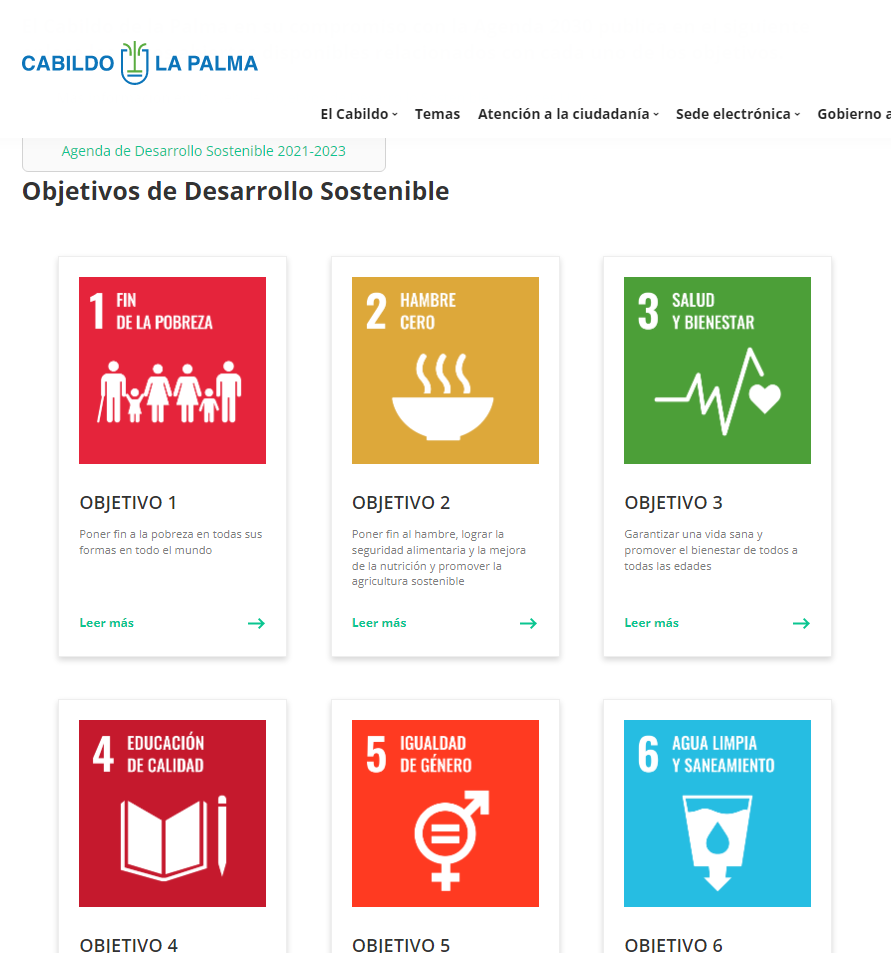 El Cabildo insular de La Palma en colaboración con la Reserva de la Biosfera de la Isla de La Palma cuenta desde el año 2021 con una sección en su web que localiza y centraliza las diversas acciones y políticas relacionadas con los Objetivos de desarrollo Sostenible en la Isla de La Palma ( https://www.cabildodelapalma.es/es/desarrollo-sostenible ). Si bien no existe un plan específico, si que se han desarrollado diversas acciones, concretamente :
