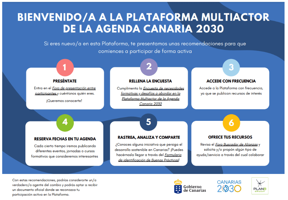 La implementación de la Agenda Canaria de Desarrollo Sostenible 2030, puesta en marcha por el Gobierno canarios hace algunos años, se ve reforzada con la Plataforma Multiactor que, a modo de espacio de trabajo colaborativo, tiene por intención la de articular y coordinar las acciones de los diversos agentes y grupos de interés. Esta Plataforma Multiactor apoya el intercambio de conocimiento y la identificación de soluciones a desafíos presentes y emergentes relacionados con el desarrollo sostenible en el archipiélago, y entre sus objetivos principales están los siguientes: